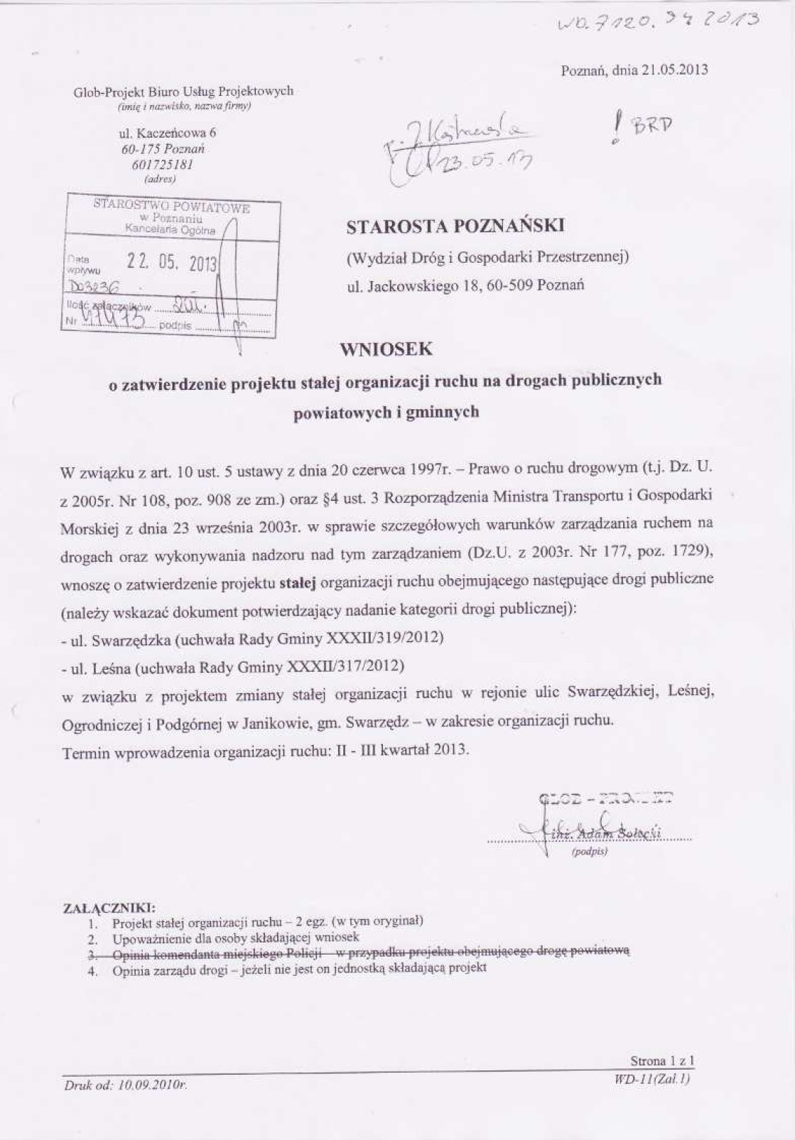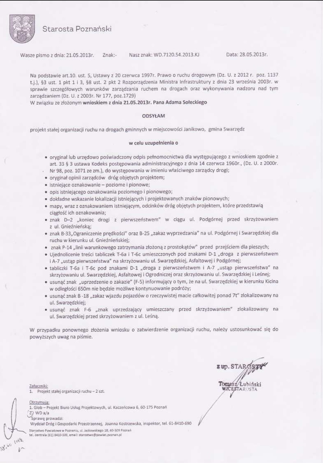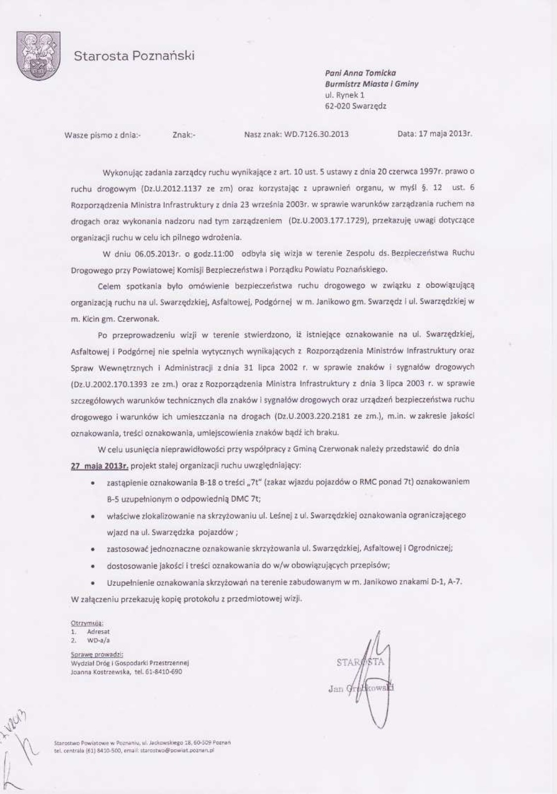 Poniżej korespondencja otrzymana od Starosty Poznańskiego w sprawie organizacji ruchu. Oczywiście od gminy Swarzędz nic jeszcze nie dotarło.