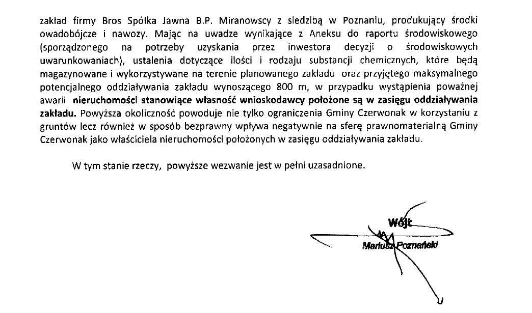 2014.10.30Kilka dni temu Gmina Czerwonak wezwała Gminę Swarzędz do unieważnienia planu zagospodarowania obejmującego teren inwestycji firmy Bros. Poniżej zamieszczamy treść złożonego wezwania.